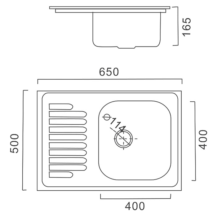 65x50x16.5 см. Толщина металла - 0,6 мм.